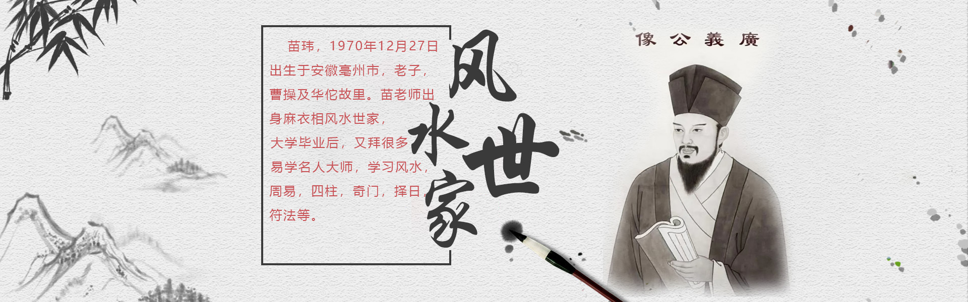 苗瑋,1970年12月27日,出生于安徽亳州市,老子,曹操及華佗故里。苗老師出身麻衣相風水世家,受家庭影響,對風水學有很大興趣,從小受爺爺父親熏陶學習風水,大專畢業后,又拜很多易學名人大師。學習風水,周易,四柱,奇門,擇日,符法等